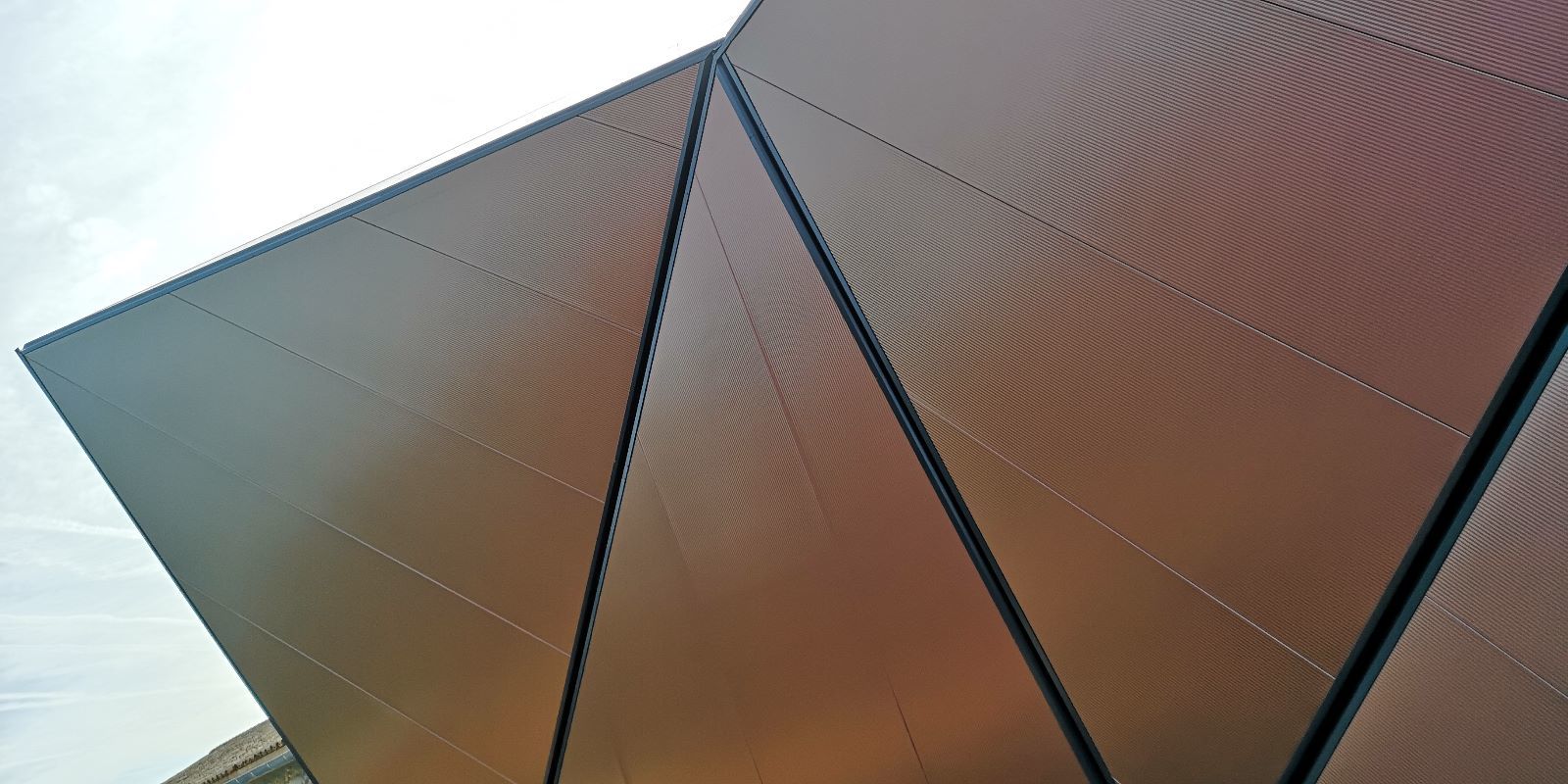 Plusieurs finitions, aspects ont été envisagés pour la « carapace », allant du « corten » en passant par de la toile tendue. Seule la teinte générale et l’ambiance étaient évidentes pour M.Canonne et moi-même, à savoir rester dans une teinte chaude (orangée, cuivrée) afin de rester en dialogue avec le site et les toitures existantes.