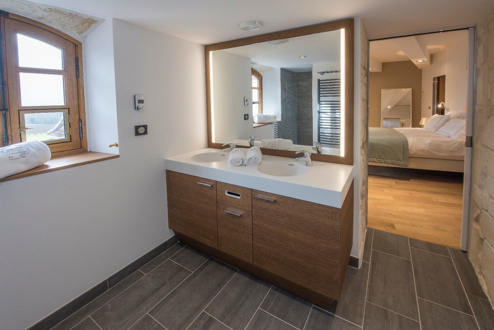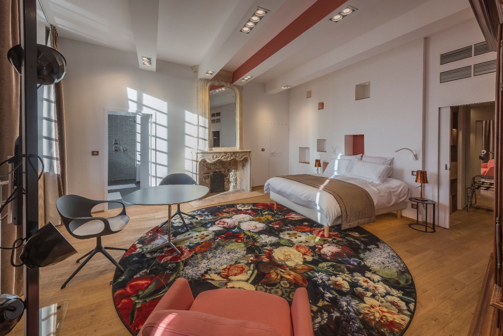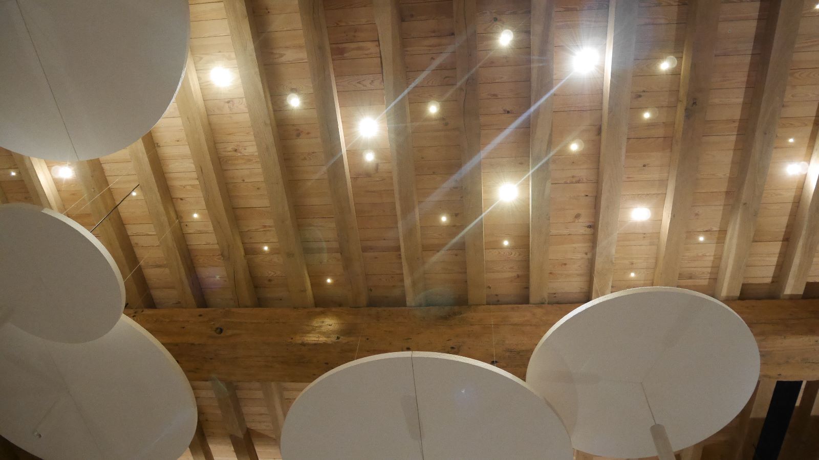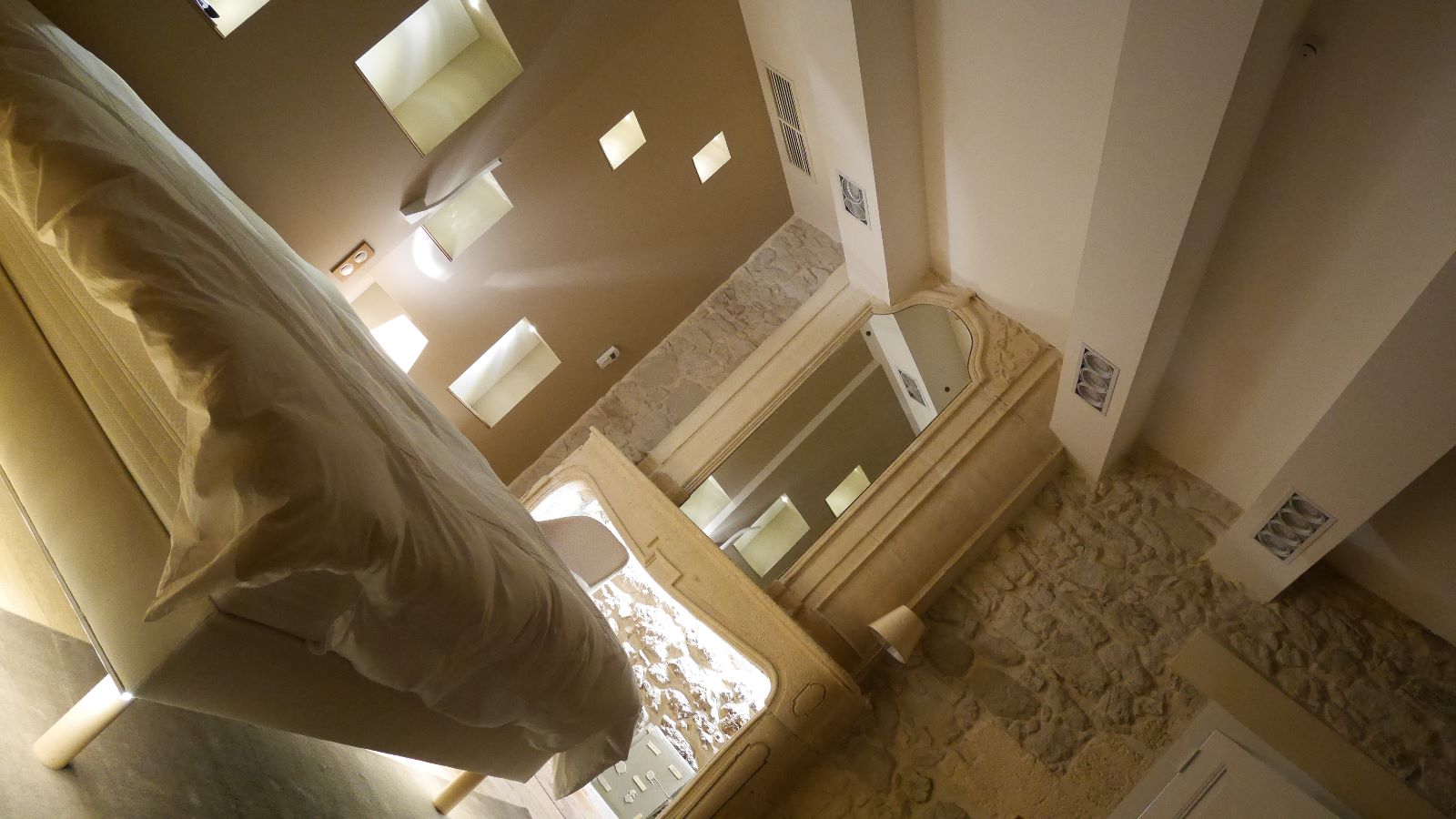 L'ensemble des chambres présente ainsi des murs obliques et des poutres massives également de biais, afin de casser le rythme des pièces. L'objectif est de surprendre, de perturber à la fois le regard et les sens, dans la douceur, pour laisser le temps de la découverte.