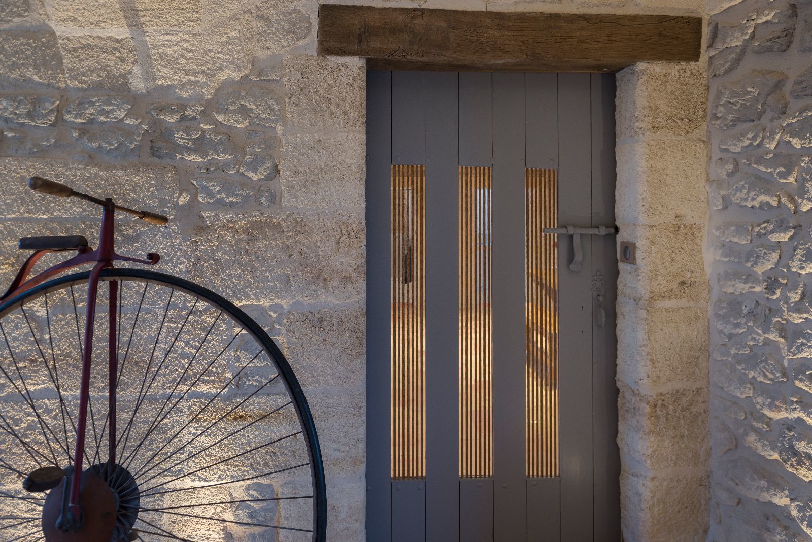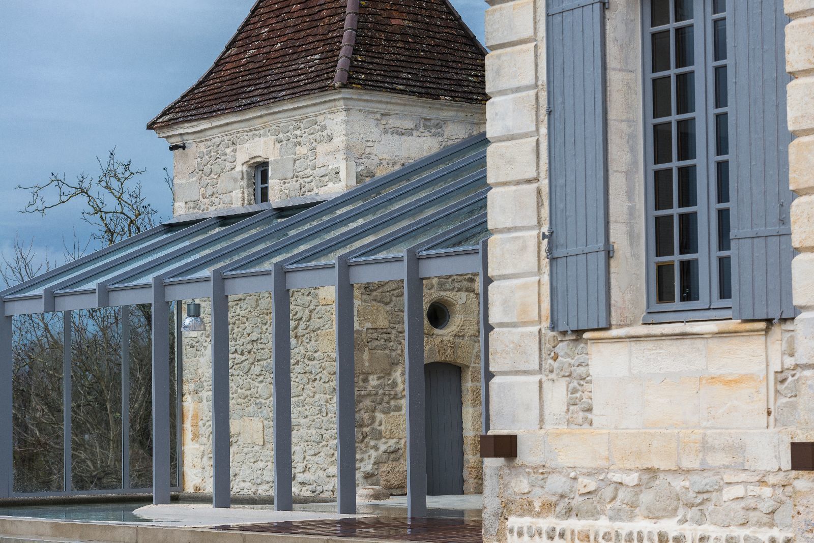 L'idée principale de la rénovation a été de conserver au maximum l'âme de la bâtisse, conserver son aspect ancien, rural et classique. Les éléments contemporains ne sont, dès lors, que très peu visibles de l'extérieur, si ce n'est quelques touches, telle que le béton brut utilisé pour le portail ou le muret de la grande terrasse en façade Sud. Les parties en béton brut sont également recouvertes de pierre taillées de Bordeaux afin de marier ancien et contemporain.