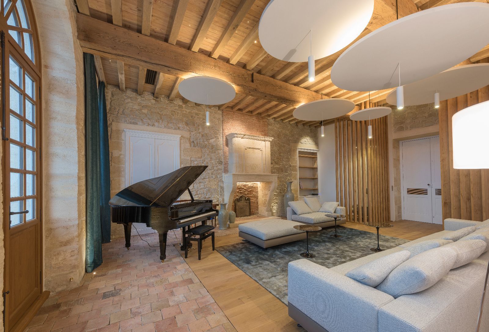 Le premier impact visuel est classique, ancien, mais une seconde lecture plus contemporaine apparait par transparence au travers des vitres, notamment par les éclairages en zigzag visibles en second jour dans le vestibule.